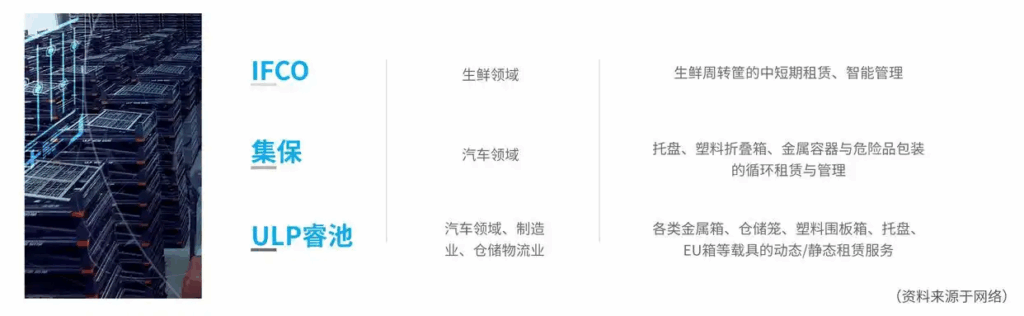 在循环包装细分赛道中,IFCO、集保、ULP睿池已形成差异化龙头效应:IFCO聚焦生鲜领域,依托全球3.1亿周转筐共享池和动态租赁模式,通过标准化折叠筐与数字化管理系统(如RFID追踪、移动端APP)降低果蔬供应链30%-50%备筐量需求,年减碳量对标720亿个一次性塑料包装替代潜力;集保则深耕汽车产业链,以UN认证危险品包装解决方案(如锂电池运输专用箱)和全球共享网络覆盖60余国,通过海运优化堆叠设计和厂内周转中心(CMC)管理,帮助特斯拉等车企降低12%物流成本并实现供应链碳中和目标;ULP睿池凭借动态/静态租赁组合模式与全国智能调度网络,服务比亚迪、吉利等车企,以及其他制造业、物流仓储业合作伙伴,实现零部件/物料跨区域周转,通过“云箱管理系统”实现包装全链路可视化追踪,推动各类循环包装载具(金属周转箱、塑料围板箱、EU箱、仓储笼、托盘等等)年周转次数提升至50次以上。